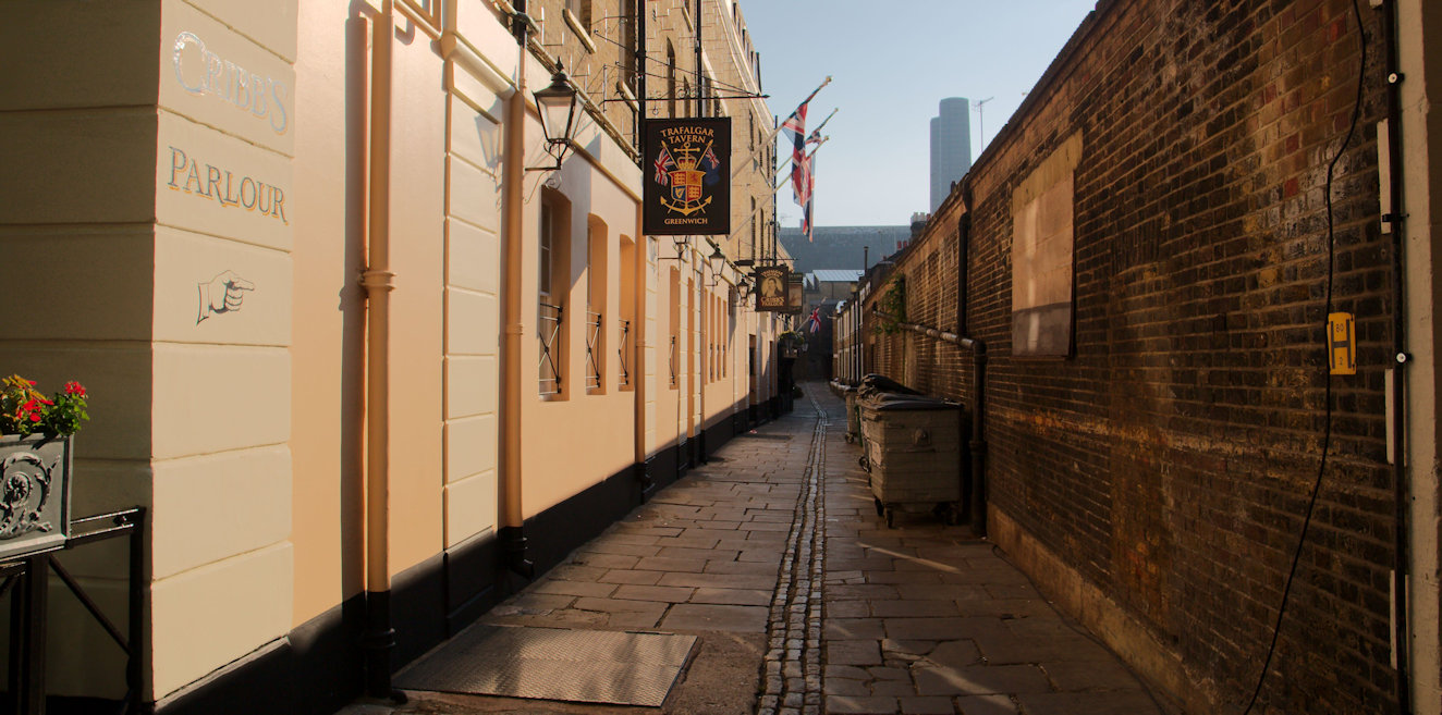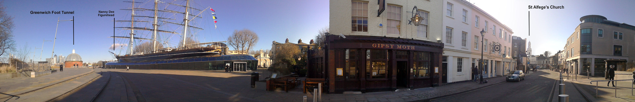 From this position facing the Cutty Sark you can see the entrance to the tunnel under the Thames to your left by the river, and the Gypsy Moth pub to your right.