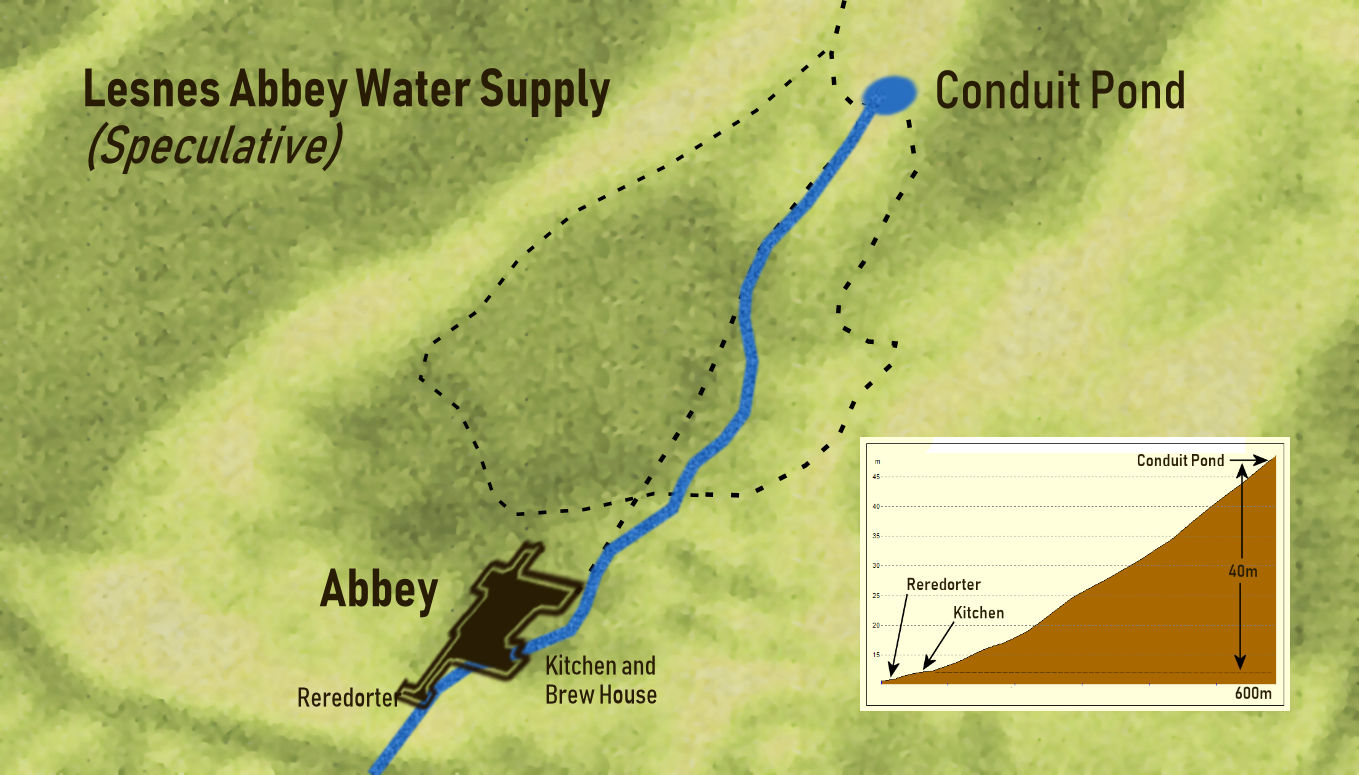 Lead pipes may have also been used as they were in other sites such as Waltham Abbey especially as the run was relatively short, but these would have been normally been protected by stone conduits and some evidence of these should have been traceable and found unless they were taken and reused for another building.