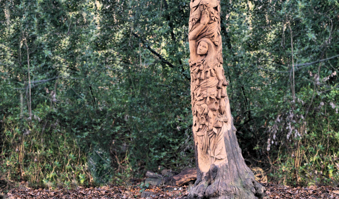 This large totemic sculpture is by Tom "Carver" Harvey and he is responsible for most of the tree carvings in the abbey grounds and woods.