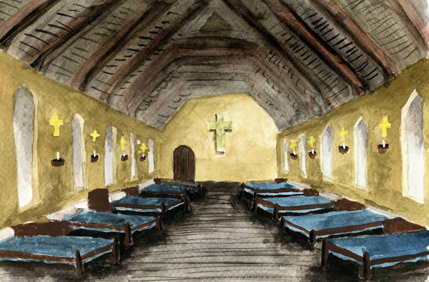The sick were held in a large hall in the centre and there was a chapel sited at the eastern end.